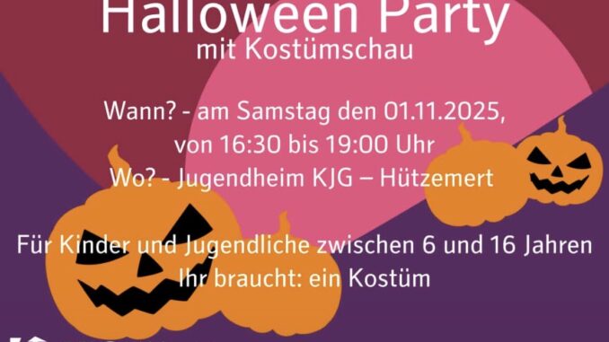 Hützemert. Am Samstag, den 1. November 2025, lädt die Katholische junge Gemeinde (KjG) Hü̈tzemert alle Kinder und Jugendlichen zwischen 6 und 16 Jahren herzlich zur großen Halloween-Party mit Kostümschau ein.