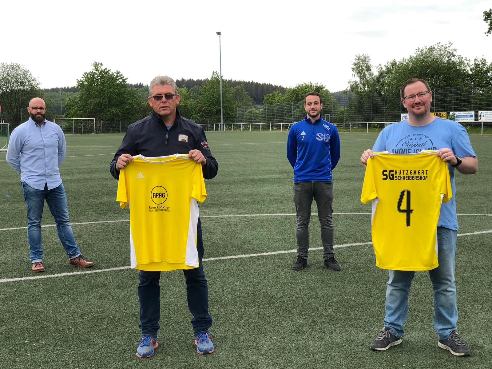 Trainer Duo 2020 Auf Abstand: Daniel Ortmann (Abteilungsleiter Fußball Hützemerter SV), Dirk Laube, Yannik Kreis (Kassierer FC Schreibershof), Sebastian Halbe